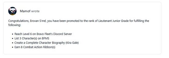 | ''Considering everything mentioned above and his time in grade, we are delighted to promote MEMBER Y to the rank of Commander and commence the next chapter of his journey in Bravo Fleet. We are excited to see him earn more awards and write on a new ship now that he has become a Commander!''