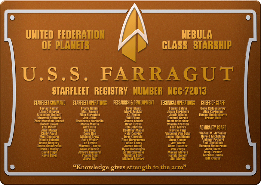 There is a long history of ships with the name Farragut, originally named in honour of the nineteenth-century Earth naval officer, David Farragut. In Starfleet service there have been at least three starships named Farragut that served with distinction: the Bellerophon-class USS Farragut NCC-1647 launched in 2243; an earlier Nebula-class USS Farragut NCC-60597 destroyed in 2373; and an Excelsior-class USS Farragut that served in the Dominion War.