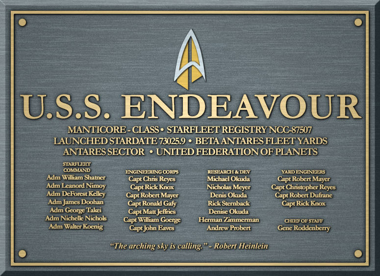 The USS Endeavour NCC-91502 is an Obena Class starship assigned to the Fourth Fleet under the command of Captain Matt Rourke. In late-2399, Endeavour was attached to a diplomatic mission to the Neutral Zone to further Federation interests in the region and develop stronger relations with the Romulan Star Empire and Romulan Republic.