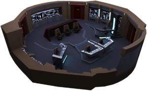 Around the command center, four doors provide access to and from the bridge. On the forward port bulkhead, access is available to the observation lounge and Executive Officer's ready room, whilst the starboard door grants access to the commanding officer's private ready room (available for use by any officer in command of the ship), and a forward turbo lift granting express access to key locations only, such as engineering, shuttlebay 1, sickbay, the brig and transporter rooms 1 and 2. At the aft of the bridge, both doors provide access to turbo lifts which enable the crew to access the command center from the rest of the bridge.