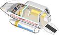 Entry is provided through a hatch under the nose of the vehicle, which also serves as a ramp up into the cockpit, which contains free-standing consoles for a pilot and mission specialist. It has reconfigurable seating in the aft compartment that can serve in many variations ranging from bench seating for six, to front-to-back chairs for eight, to an executive configuration with a comfortable lounge space for senior officers.