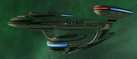 The Grissom has a single shuttle bay located on the aft end of the primary hull, where it meets the secondary hull. It is capable of carrying only two small shuttles or four shuttle pods. Notably for a ship of this size, the Grissom has six heavy tractor beam emitters placed around the ship, which are used both for standard towing missions and to manipulate objects like asteroids or comets for scientific purposes. Two are located near the center of the secondary hull on the dorsal surface, with direct connections to the ship's main power conduits.