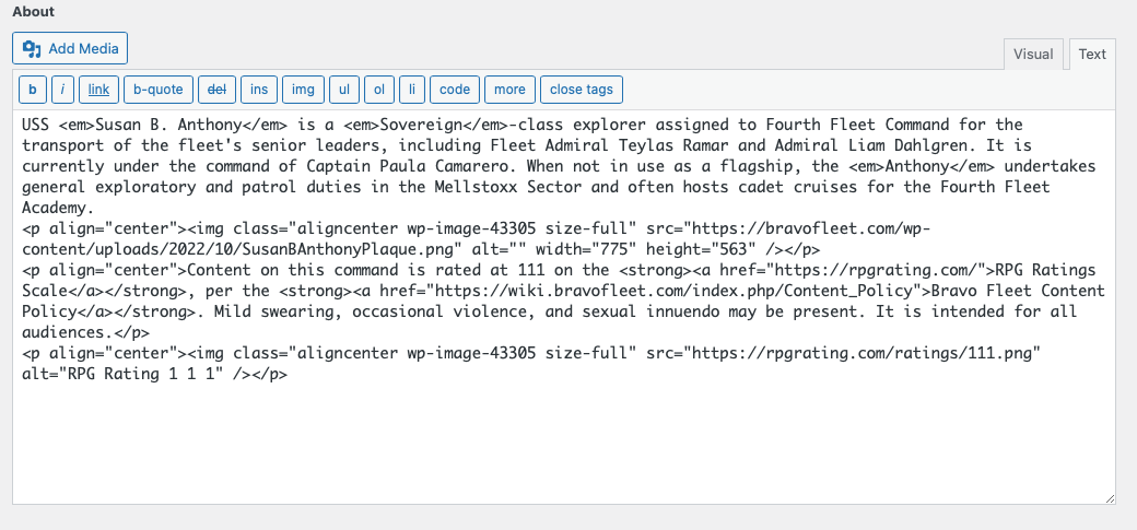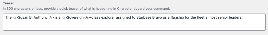 The Summary is a short (less than 300-character) description of your command, meant to entice readers to keep scrolling. This is the first box you will fill out under the manifest on your command. This is a plain-text area, so you will need to use HTML code for italics in ship names. Some folks use this area to display their dedication quote. Others update it regularly to mention the current mission. Some leave it static. Here is an example of the front and back ends for our example command, the USS Susan B. Anthony. Note: when an overlay image is used, or in banner mode, the ship's summary is not visible.