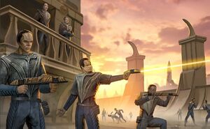 In mid-2401, Starfleet’s Outpost C-91 in the DMZ was attacked and destroyed. Eyewitness testimony and damaged sensor records pointed the finger not at the True Way - who had acted as insurgents far more than a direct military threat - but Cardassian Central Command’s newer, more advanced ships upgraded with Dominion technology. Even as the Cardassian Union denied the accusations, the Federation pointed the finger, with Starfleet convinced that Central Command had funded and equipped the True Way. The more hawkish in Starfleet warned that the Union had always bristled at losing the old DMZ in the Treaty of Bajor, and, with tensions rising with the Klingon Empire in the Beta Quadrant, might jump at the opportunity to recover them. Diplomats, however, stepped in to insist on a joint investigation by a shared Cardassian-Starfleet mission.
