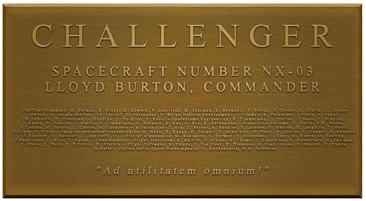 The Challenger (NX-03) was the third NX-class to be launched by the United Earth’s Starfleet. The ship was launched on February 8th, 2155 from the orbital facilities above Earth. She was named after the ill-fated space shuttle craft Challenger. The ship’s motto was in Latin and when translated to English meant To the benefit of all.