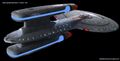 Very unusual for Starfleet ships, the Challenger-class has its nacelles arranged vertically rather than horizontally. In addition, these nacelles are slightly off-center from one another, which makes them more efficient at higher speeds than other ships, though inefficient at lower speeds. These warp nacelles are proportionally large compared to the ship's hull and can propel the ship at speeds similar to their much larger contemporaries, the Galaxy and Nebula-classes. Impulse power is provided by a pair of engines located on either side of the saucer adjacent to the long, thin secondary hull.