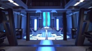 The reaction chamber of an Intrepid-class starship's matter/antimatter reactor, known as a dilithium swirl chamber.