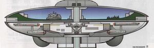 Eos Station features a typical 23rd-century Federation design, consisting of a saucer-shaped primary hull with a central command tower and four main docking bays capable of servicing Constitution-class starships or smaller. Positioned halfway down is an external docking wheel, while the energy reactor housing and multi-spectrum array are located at the bottom of the station. The command tower houses the shuttlebays, medical center, support offices, and an impressive two deck operations center. Support facilities, crew quarters, and crew accommodations are also housed within the primary hull. Phaser arrays are evenly distributed around the station's exterior.