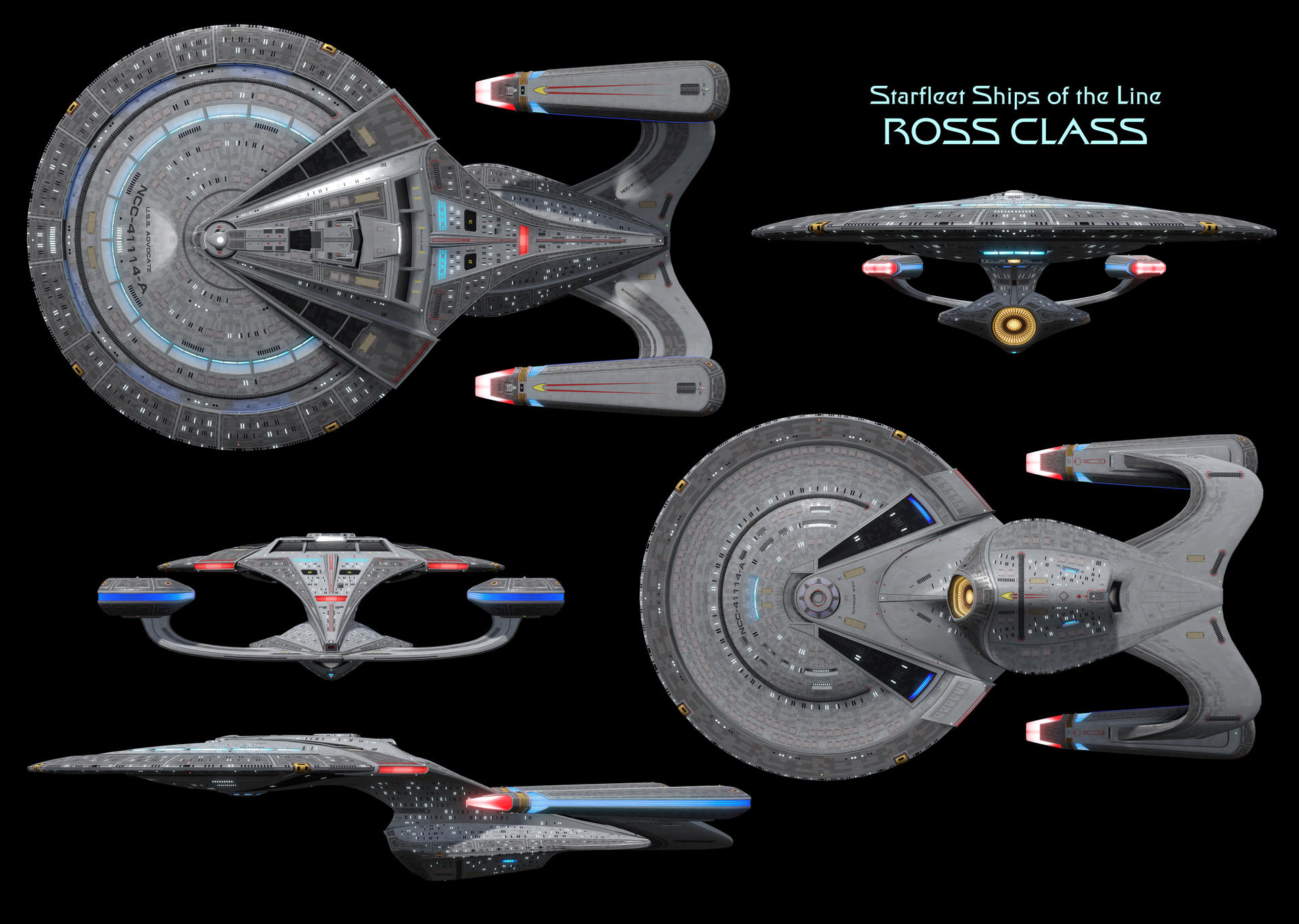 Ross-class orthos rendered from the STO model by Enethrin https://www.deviantart.com/enethrin/art/Ross-Class-Starship-High-Resolution-903450771