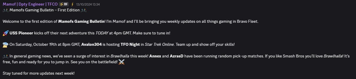 Example of a TF17 Gaming Bulletin