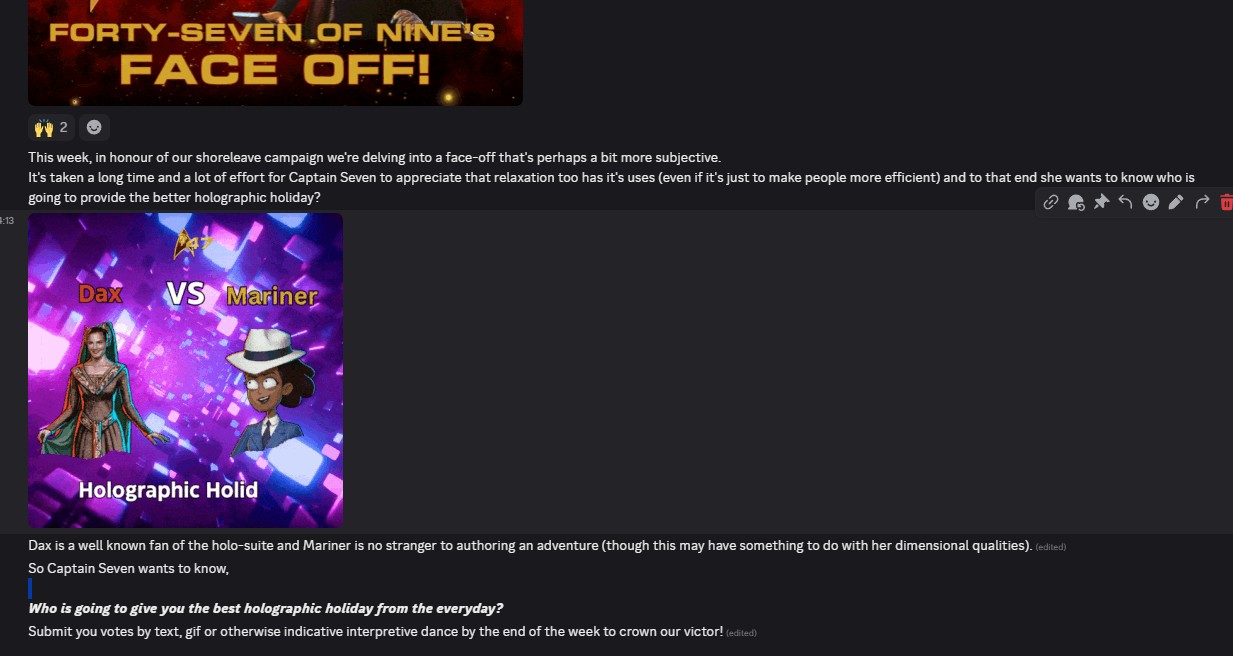 A faceoff style head-to-head of characters or entities (e.g ships) within the universe under the playful idea of Captain 7 of 9 attempting to rank the galaxy.