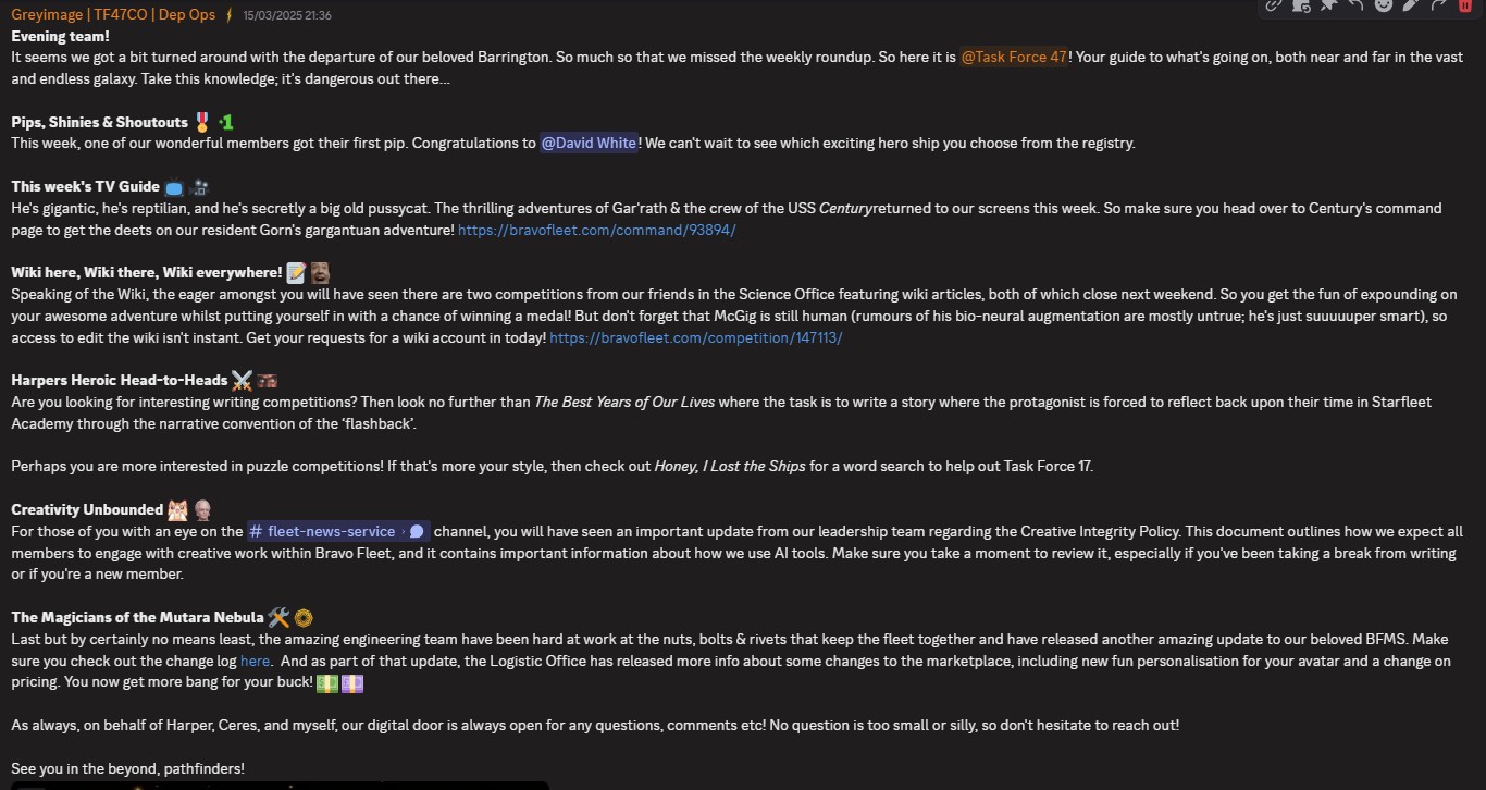 A simple concept highlighting gaming activity within the fleet — upcoming events, what members are currently playing, and notable gaming trends across the fleet. Perfect for mid-week or biweekly updates.