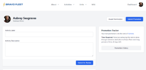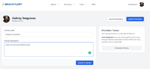 Once you have submitted your activity report, your TF staff will be able to nominate you for the appropriate item, if applicable. Note: promotions at the junior officer ranks are also listed on your activity tracker as a series of milestones. It's not necessary for you to note which of these you are attempting to complete, or to list particular items you'd like to be used, as TF staff will select the most efficient path for you to advance.