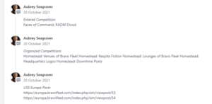 You do not need to report the following items: fiction (these awards come automatically), placement in competitions, promotions, staff positions, awards, or your Discord level. You do not need to report anything that shows up on the front-end of your dossier, which includes ribbons, medals, or placing in competitions. These items are checkable by the staff in other ways. Video game activity reporting is covered in the next section.
