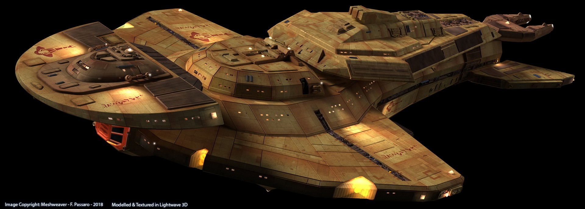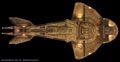 Where the design of the Keldon differs from the Galor is in extensions to the dorsal superstructure and stern. The superstructure has been expanded with a large, roughly anthropoid module that contains barracks space, expanded fuel tanks, and additional crew quarters, which allows the ship a longer range and the ability to carry a thousand troops in relative comfort. The stern of the Galor design has been widened with two additional wings, each of which contains an additional phaser emitter, redundant shield generators, and auxiliary power generators.