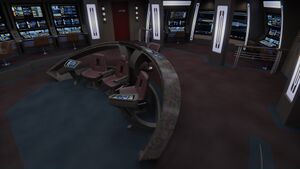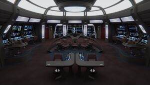 Normally this space remains configured for systems oversight and damage control, with the primary monitor defaulting to a Multifunction System Display, but as with all large monitors aboard the ship, can be quickly reconfigured for a variety of tasks. It would not be uncommon during long transits for this space to be repurposed for survey work or control of the ship while the bridge itself might be used for simulation training of junior officers. Flight operations, crisis management, scientific research and many other pursuits can and will find themselves here at some point.