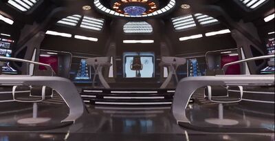 The bridge of the USS Hikaru Sulu follows the 25th century school of naval design that favors austere, clean decks and utilizes both a high degree of automation and configurable holographic displays.
