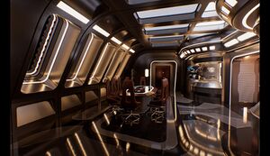 The observation lounge operates an open-door policy and, in the absence of a more traditional ready room attached to the bridge, the Captain often uses the observation lounge as a workspace so that they do not have to return to their quarters, where their actual office is located.