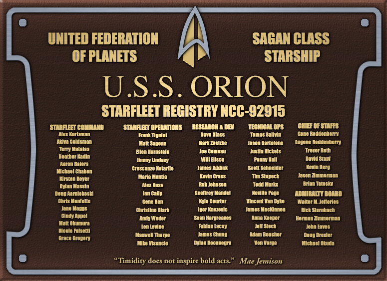 The USS Orion (NCC-92915) is a Sagan-class Federation starship. The Orion is a light explorer and was launched several days prior to Frontier Day in 2401. The Orion did participate in the events of Frontier Day and was badly damaged when the ship was overtaken by the Borg. Thankfully, its repairs did not take too long, and the ship was repaired by mid-2401 for its shakedown cruise. The ship was placed under the command of Captain Mo'Lee-Krabreii and assigned to the Odyssey Squadron in late 2401.