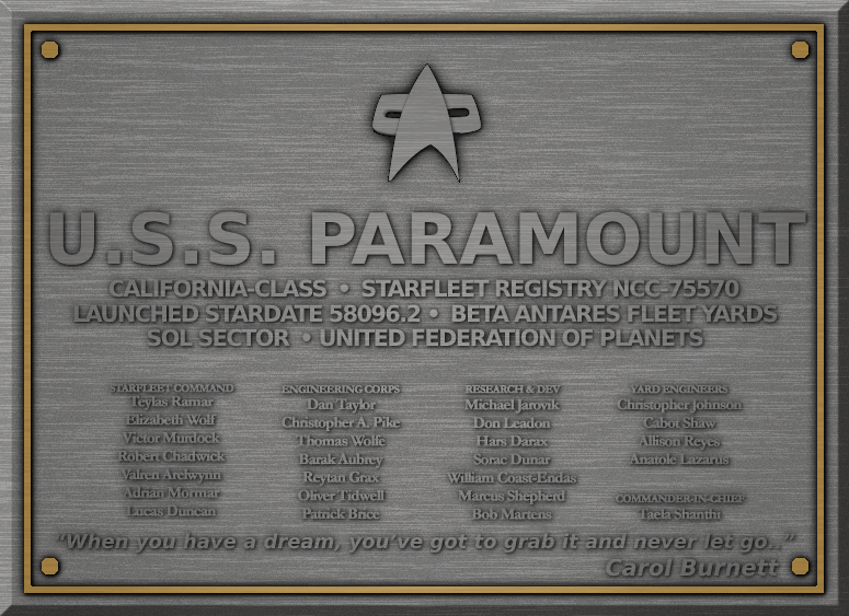 The USS Paramount (NCC-75570) is a California-class utility cruiser under the command of Commander Nitus, the crew carried over the her previous command. Commissioned in November 2381, assigned to the Fourth Fleet's Task Force 17. After having undergone a major overhaul, she now features the latest in technological innovations and systems.