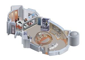 The Main Bridge was located on Deck 01 of the Paramount alongside the Captain's Ready Room and the Observation Lounge. Her most extraordinary feature is a wide-angled window that fills the forward bulkhead. This window has holographic projectors built into the rim, allowing it to function as a more traditional viewscreen. It can also be used as an emergency evacuation hatch, with force fields being lowered until replaced by a large, external bulkhead.