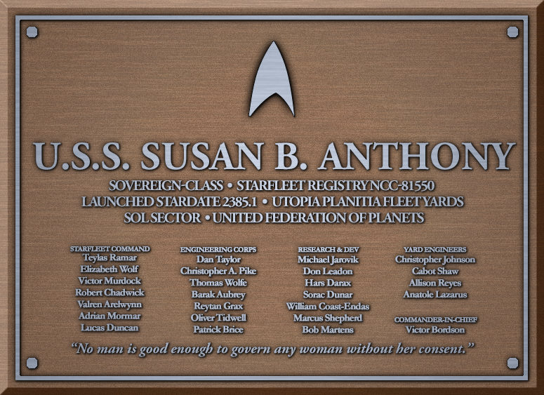 The Susan B. Anthony was one of several Sovereign-class starships ordered following the Dominion War as part of Starfleet's larger rebuilding process. Named after the noted suffragist, she was the first Starfleet vessel to bear the name. She was constructed at Utopia Planitia Fleet Yards and was one of the last starships to leave those yards before they were destroyed in 2385. Alongside her sister ship Yamato, the Anthony was pulled off of her shakedown cruise to secure the Sol system and provide aid in the immediate aftermath of the disaster.