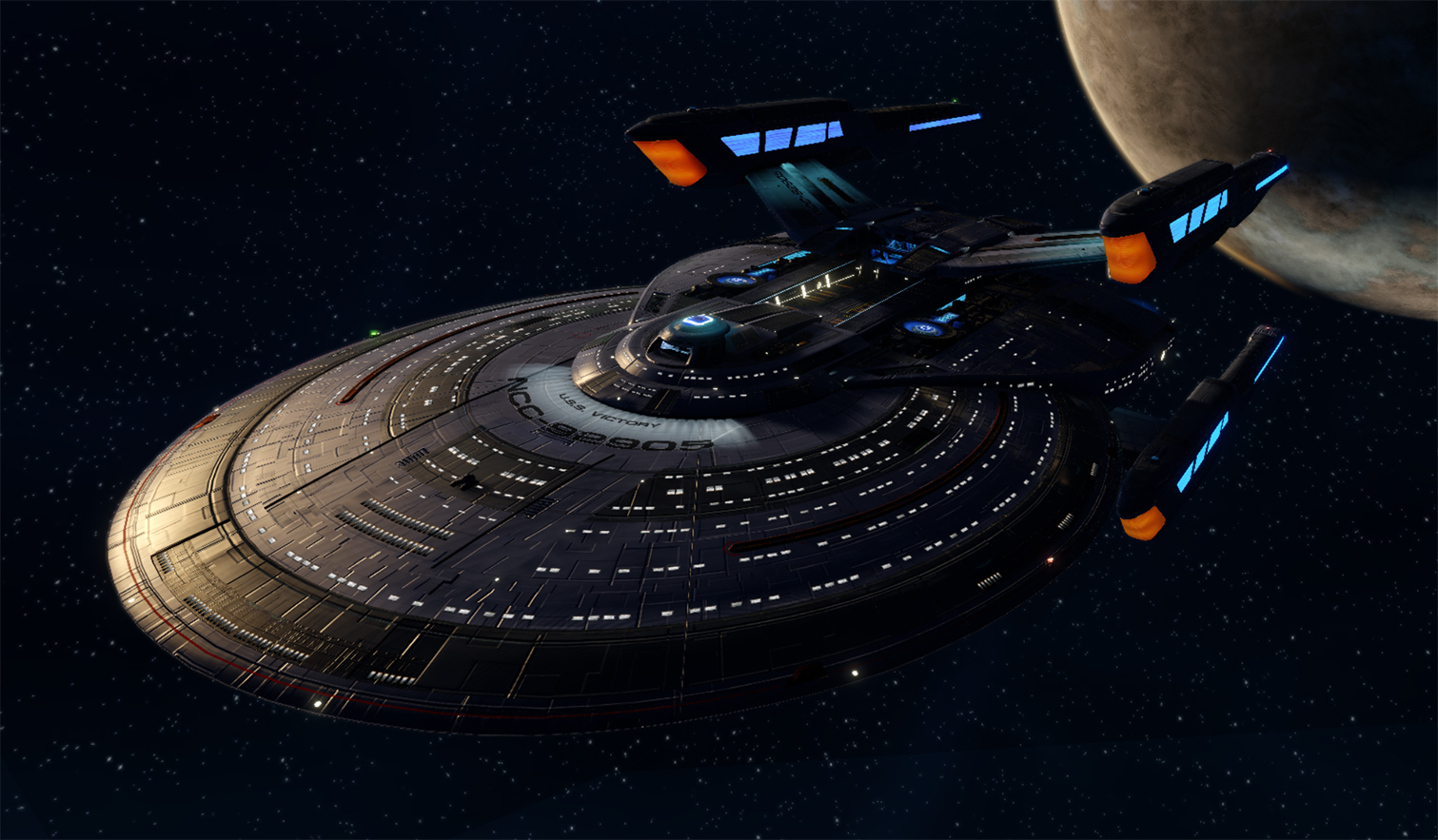 Launched in 2402 from the San Francisco Fleet Yards, the Victory is a cutting-edge exploratory vessel designed for missions outside of Federation space. The ship is among the rarest in Starfleet, deploying a number of Borg-derived systems and operating advanced systems such as multiphasic shielding and Type-XIV phaser arrays.
