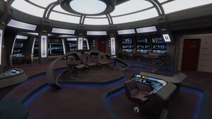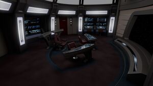 Shortly before her reactivation, the Yamato's bridge was redesigned and expanded to accommodate her expected mission profile of long-term exploration. It features a raised command area with space for the Command Officer, Executive Officer and an advisor. This is flanked by a large rail containing the tactical station. The port side of the bridge contains the engineering stations, with the science station on the opposite side of the bridge. The aft section of the bridge contains additional engineering and operations stations that can be reconfigured based on the mission profile and a large holotable showing a detailed readout of the ship in front of the large master systems display on the aft bulkhead. Toward the front of the bridge are stations for the flight controller and operations officer sitting in a slightly lowered section. Access to the bridge is provided by three turbolifts, one each toward the bow on the port and starboard sides and one in the starboard-side aft position. Access to the CO's ready room and XO's office are available at the front of the bridge next to each turbolift. Access to the observation lounge is available on the port-side aft of the bridge.