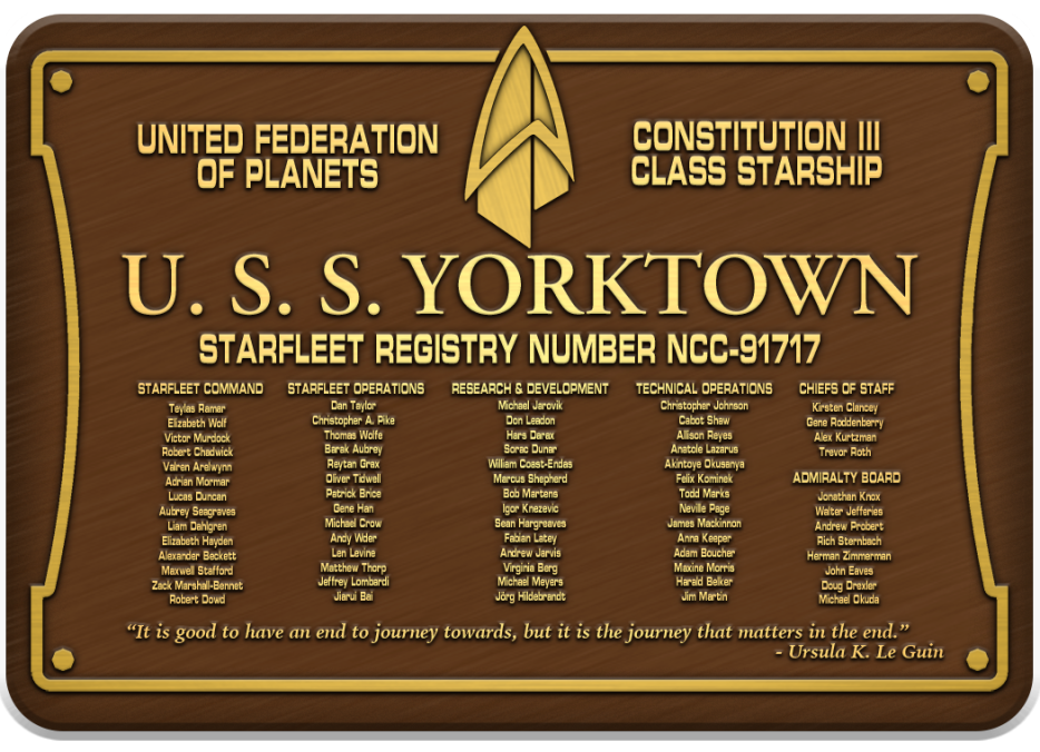 The USS Yorktown is a Constitution III-class starship that currently serves as the flagship of Starfleet's Fourth Fleet. Originally slated to be named the USS Exeter, the Constitution III in drydock was renamed Yorktown after the previous Echelon-class Yorktown was destroyed during the events of Frontier Day.