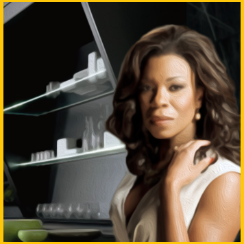 • The image used here is an image of Lorraine Toussaint edited by me to appear in front of a modern kitchen/restaurant backdrop, with an oil painting filter used to lessen the disconnect between the background and the subject. A Bravo Fleet frame and logo were added.