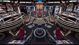 In a move away from more recent styles, and harking back to the traditional layouts of yesteryear, the Buran has a single center command seat for the commanding officer allowing the occupant full view of all stations. Directly ahead of them, down a few steps and between the commanding officer and the holographic viewscreen, two consoles have been merged into one single station, serving as duty stations for Operations (port) and Flight Operations (starboard). Surrounding the bridge, an additional four duty stations make up the rest of the command center's capacity. On the starboard bulkhead, two stations are dedicated to science (forward) and mission operations (aft), while on the port bulkhead, stations are reserved for tactical operations (forward) and engineering (aft).