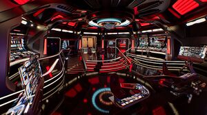 A reflection of the time period she was created, the Excelsior II-class' polished steel, cool metal fixtures and her bridge aesthetics bring back memories of years gone by, her design blending modern technological advancements with the nostalgia of eras long gone. It is a functional, yet aesthetically pleasing facility designed in a similar vein to the rest of the ship. Her greatest feature is a wide-angled window which fills the forward bulkhead. This window has holographic projectors built into the rim, giving it the ability to function as a more traditional viewscreen. It can also be used as an emergency evacuation hatch, with forcefields being lowered until replaced by a large, external bulkhead.
