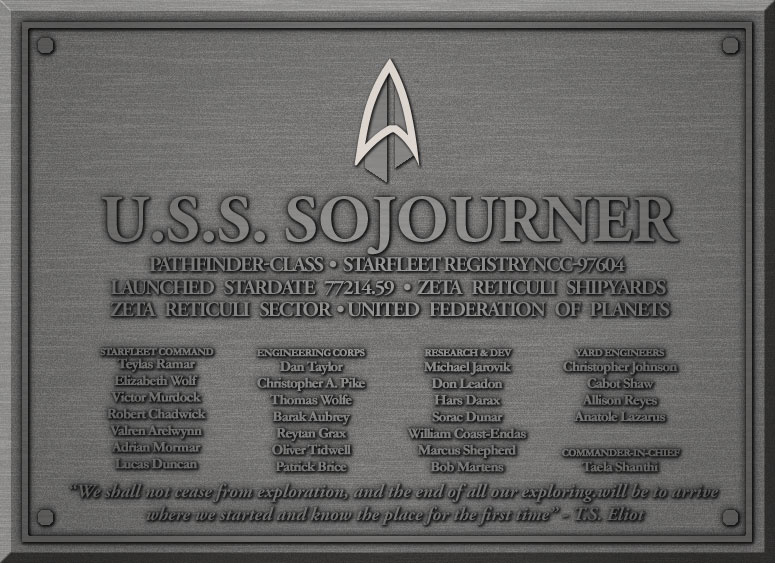 The USS Sojourner is a Pathfinder-class starship built in 2400 as a modernized and specialized version of the Intrepid-class light explorer, intended to handle scientific and exploration missions far from Federation space.