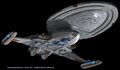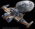 Dubbed the Frankenstein Fleet, the three Yeager-class light cruisers were an unusual marriage of design philosophies: the Class-19 Drone Freighter that made up their secondary hull and propulsion system was intended to carry large quantities of ore or large starship components between facilities without a crew, while the Intrepid was meant to be a fast, sleek exploratory vessel. Indeed, the idea for this class came about when an Intrepid-type saucer was being transported to the Beta Antares Fleet Yards aboard a Class-19 as cargo. It would have taken more than a year to finish building the ship’s secondary hull, but it was relatively straight-forward to mate the saucer directly to the freighter to combine their power networks. Additional fusion reactors were also installed to try to combat some of its power shortfalls.